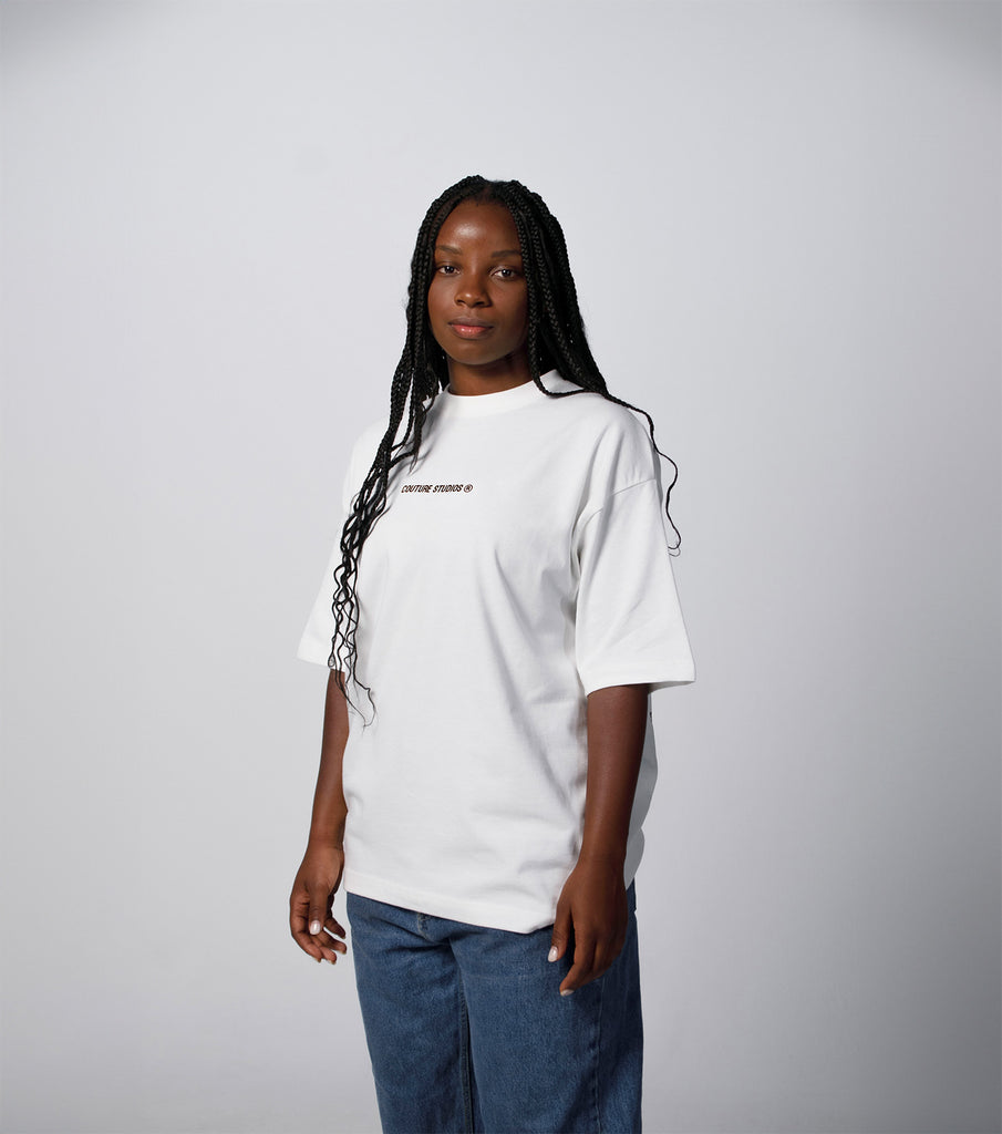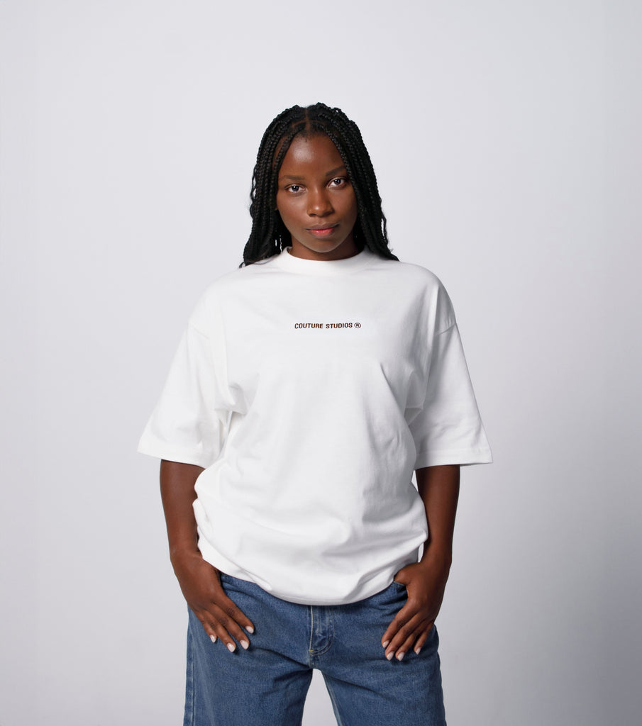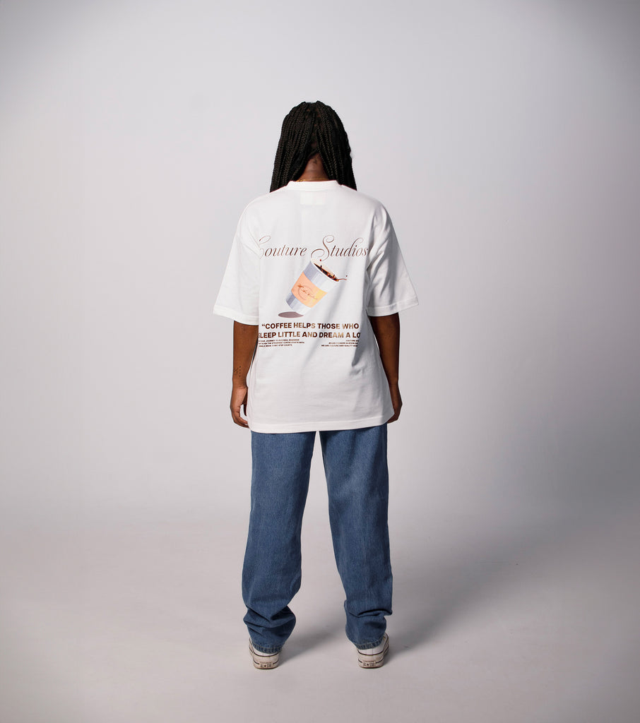 Camiseta de cuello redondo en corte oversize. Logo Couture Studios serigrafiado en la parte delantera y trasera. Imagen distintiva del drop serigrafiado en la parte trasera. Camiseta diseñada para empezar bien el día, así como lo harías un buen café, pieza esencial en el día a día. Camiseta 100% algodón 300 g/m2, diseñado en las islas Canarias.